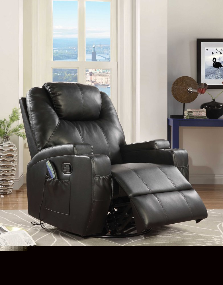 Create a luxury cinema seating experience from the comfort of your own home with this 34-inch brown faux leather heated massge home theater recliner. Durable polyurethane upholstery is soft to the touch, easy to maintain, and simple to clean with only a damp cloth. Features a warm brown coloration that will easily blend with the colors of your room. This manual recliner makes it easy for you to shift positions with a manual handle lever. This fabulous chair features massage and heat to help relieve stress, tension, and pain. From morning coffee to evening tv/movie nights and everything in between, this cozy chair will be a welcome addition to your rest and relaxation routine. Recliners are a comfortable and practical option for living room, family room, den, bedroom, or nursery. 41-inch H x 34-inch W x 37-inch D