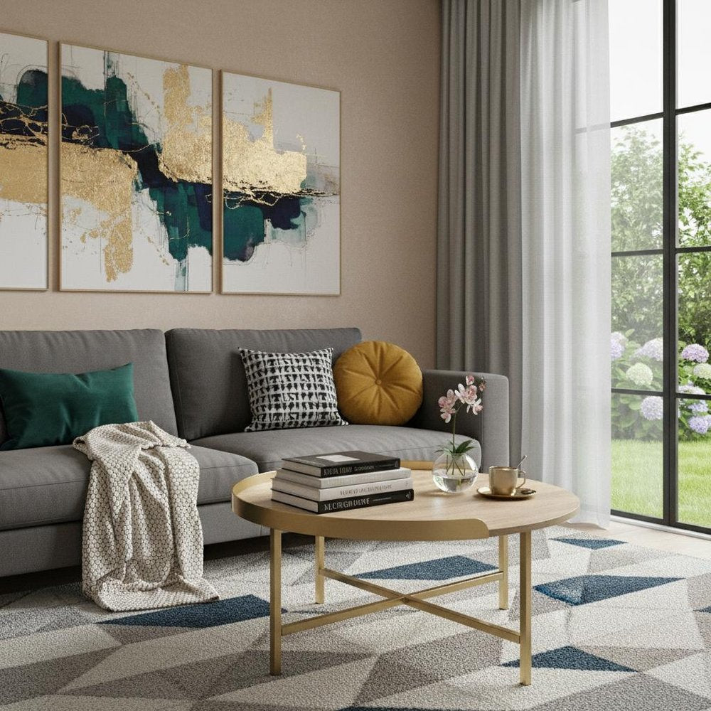 Add handsome, fashionable design to your living space with this 34-inch oak and gold wood and metal round sled coffee table. The base of this table is made from metal in a gold color that creates a good looking visual contrast to the oak manufactured wood tabletop. This unique tray top shape of the table adds dimension and extra storage. This round table utilizes its unique shape to give your room a modern geometric accent. If you're looking for something that can fit into a living area, bedroom, or office, this coffee table is for you. 18-inch h x 34-inch w x 34-inch d.
