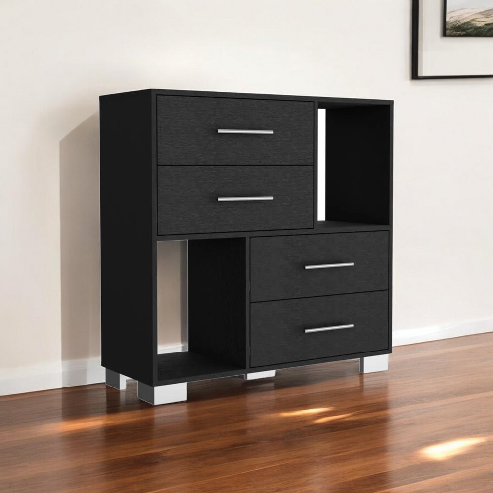 Add personality to your bedroom style and a feeling of coziness with this 35-inch black four drawer dresser. This horizontal standard dresser has a convenient and wide top area for your getting ready needs and supplies. Equipped with four easy open drawers for practical and good looking clothing storage. Its a high quality piece, made from high grade manufactured wood. The black coloration of this piece gives it an updated, and modern edge. 35.4-inch H x 35.4-inch W x 14-inch D