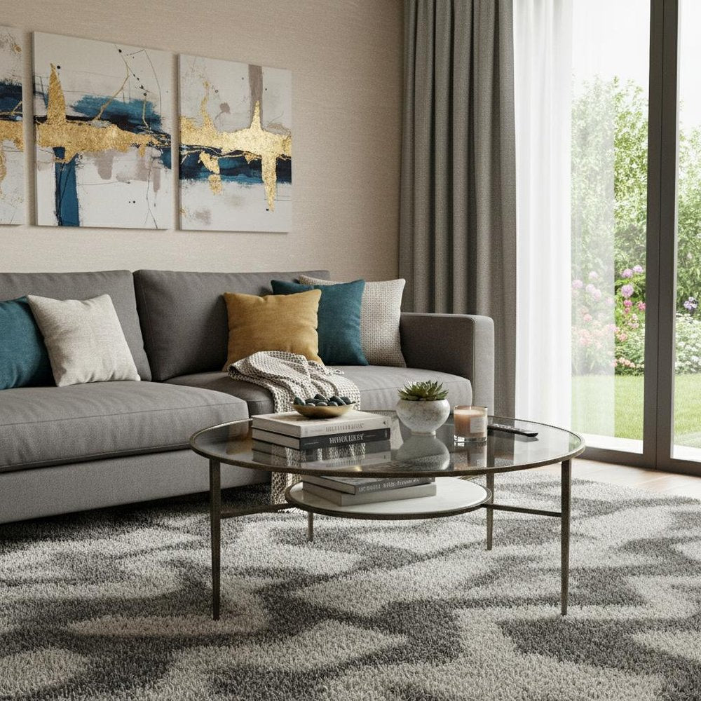 36" Clear and Bronze Glass and Metal Round Coffee Table With Shelf
