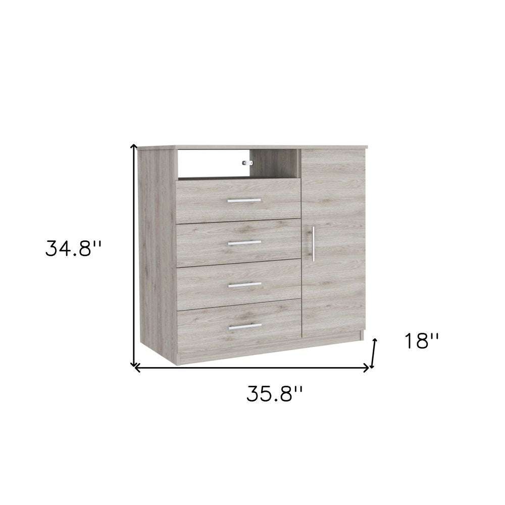 Add personality to your bedroom style and a feeling of coziness with this 36-inch light gray four drawer combo dresser. This combo dresser gives you the added bonus of both drawer storage and cabinet storage to accommodate various sizes and types of items. Equipped with four easy open drawers for practical and good looking clothing storage. Its a high quality piece, made from high grade manufactured wood. 34.8-inch H x 35.8-inch W x 18-inch D