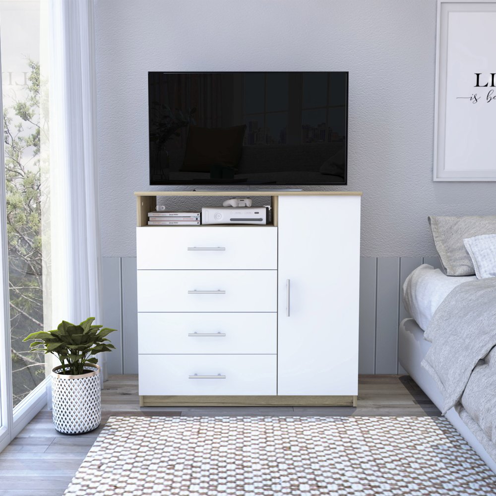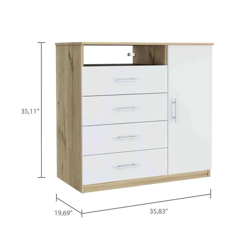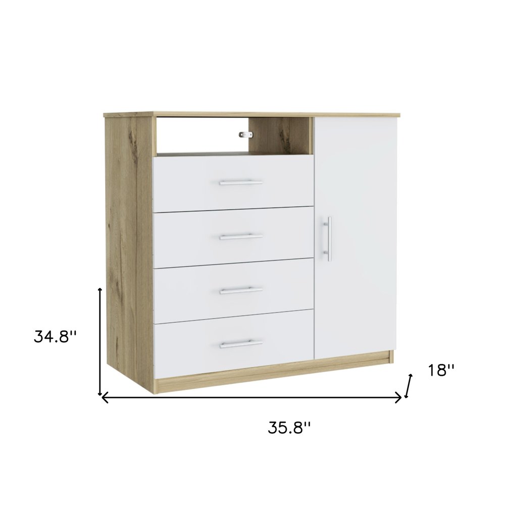 Add personality to your bedroom style and a feeling of coziness with this 36-inch white and natural four drawer combo dresser. Versatile in use, this combo dresser is equipped with both drawers and doors for all your storage needs. Equipped with four easy open drawers for practical and good looking clothing storage. Its a high quality piece, made from high grade manufactured wood. 34.8-inch H x 35.8-inch W x 18-inch D
