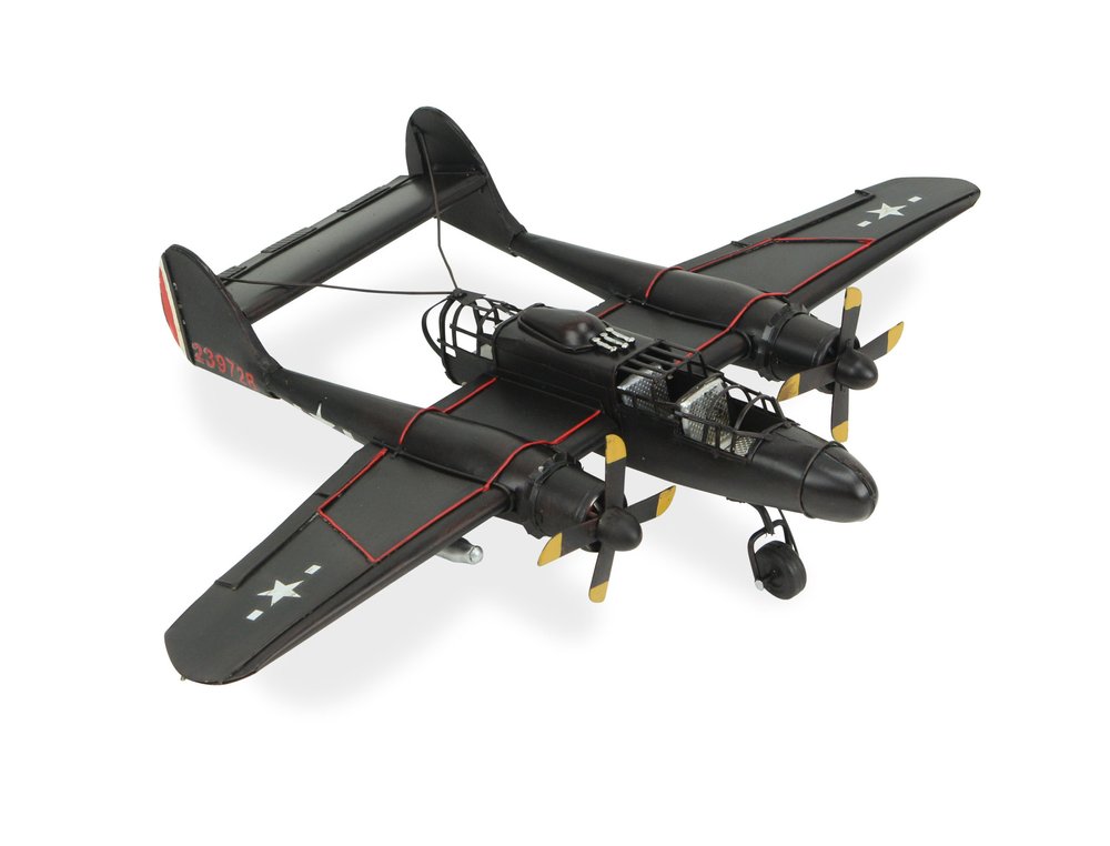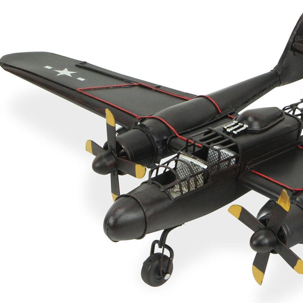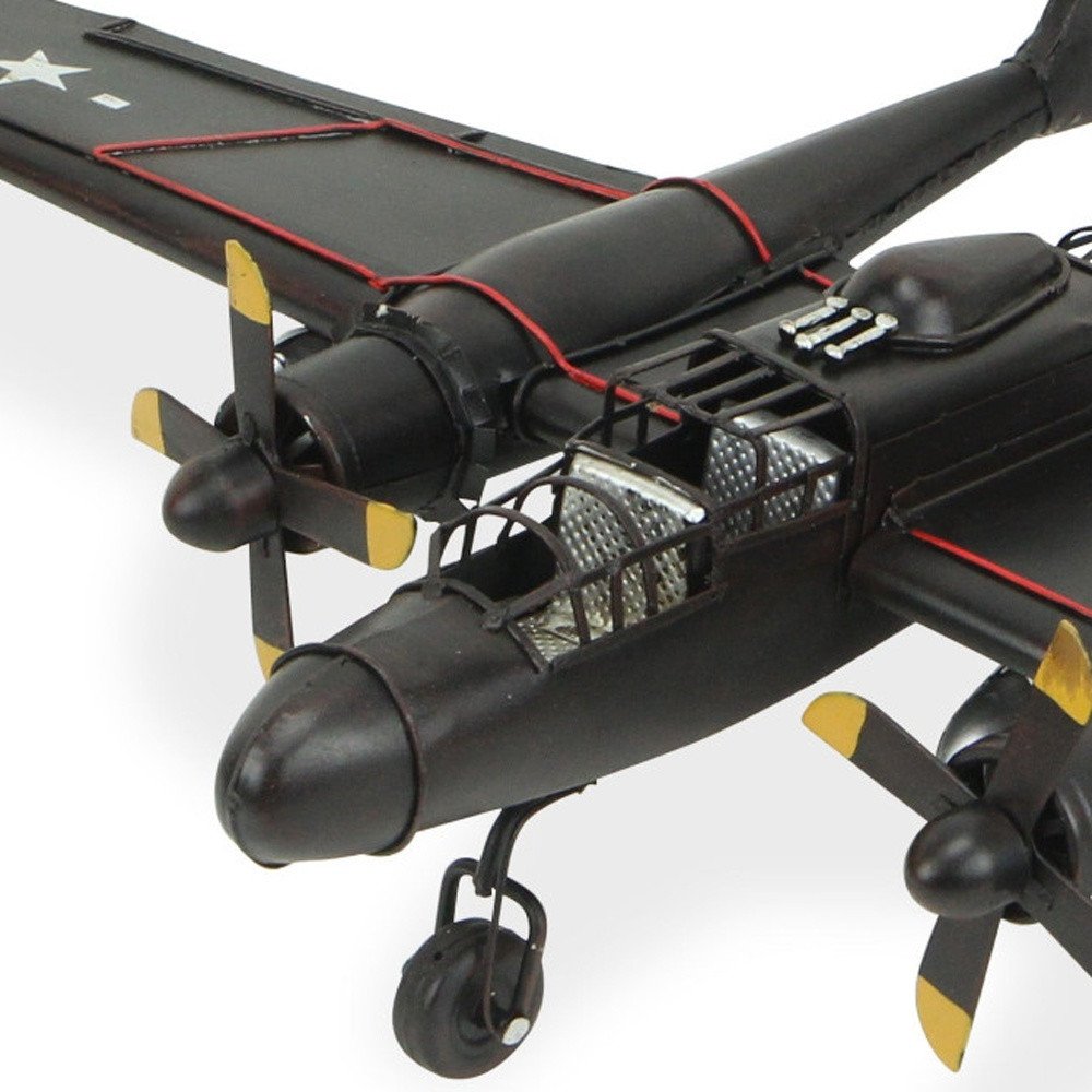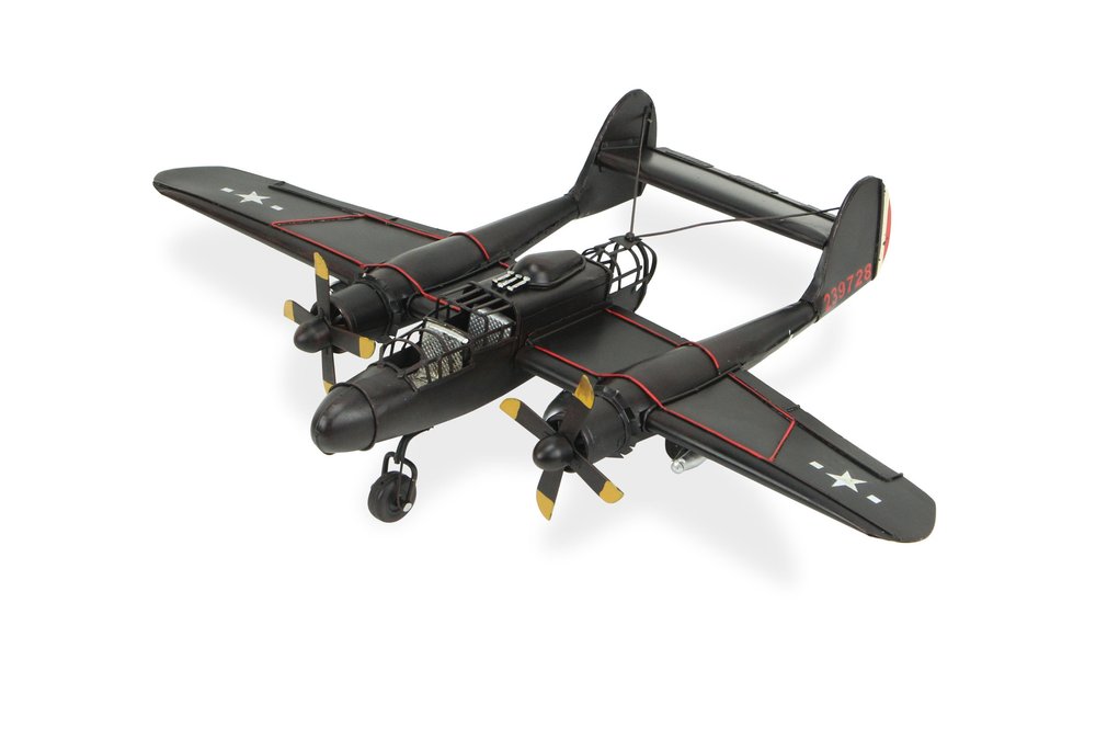 This 4-inch black and red metal hand painted p-61 black widow model airplane will add a beautiful decorative accent to your decor. The black and red coloring of this high quality metal accent will look great in most any space. This replica makes a great tabletop accent for your coffee table, desk, bookshelf, dresser or mantle. A perfect decorative addition for anyone who loves nostalgia and vintage style models and replicas. A perfect decorative addition for anyone who loves a stylish look and feel. 4-inch h x 19.5-inch w x 14-inch d.