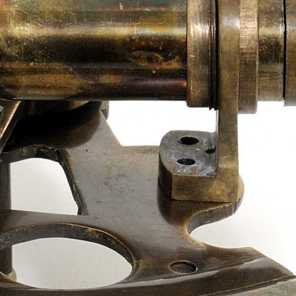 This is a functional replica of the nautical sextant. It is made of high quality brass. Each component is crafted with finest craftsmanship. Using rack and pinion mechanism, this sextant was given a heavy pattern of solid brass. Available in antique brass finish and it comes in a beautiful leather gift box. This sextant is a great addition to any nautical collection. The item dimensions are: L: 4 inches, W: 4 inches, H: 2.5 inches.