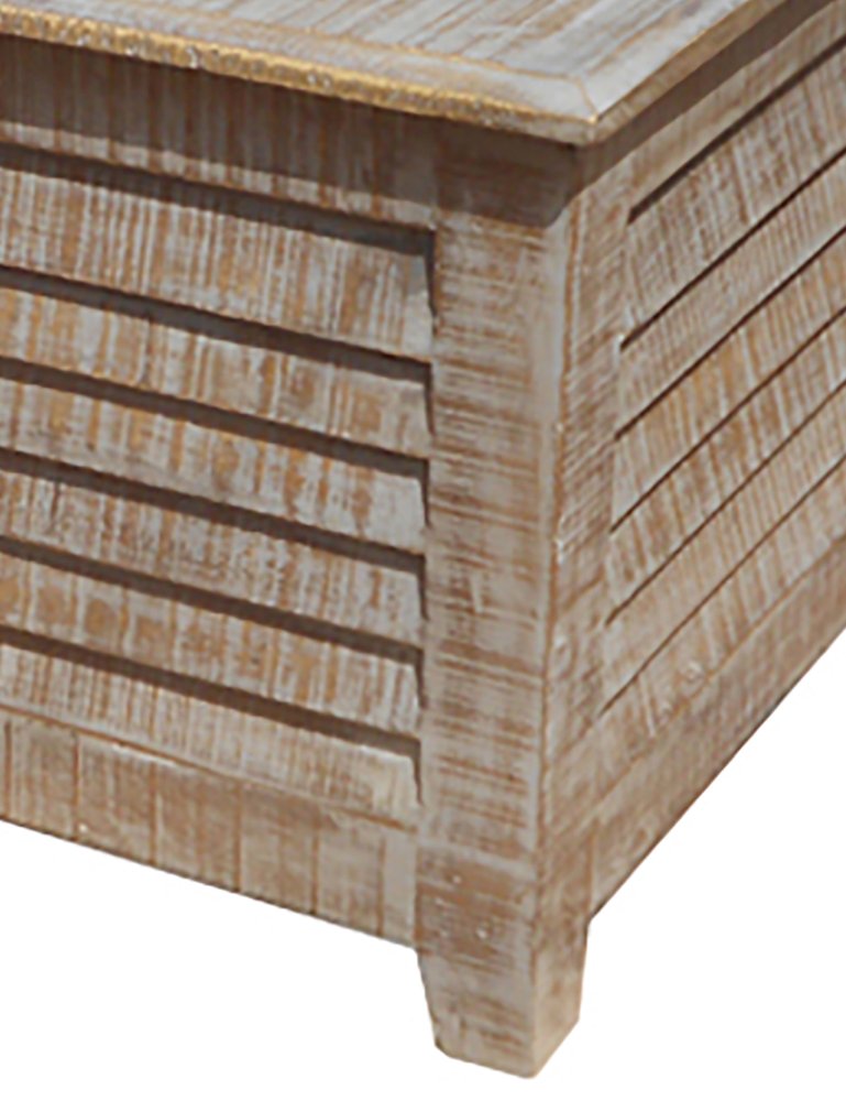 This stylish 40-inch gray solid wood square distressed lift top solid trunk coffee table is sure to inspire compliments no matter where it sits. This table features quality construction from solid wood and an updated monotone color scheme with gray as the main color on both the top and the base. Complete with a purposefully distressed finish, this table has an aged, vintage, and rustic feel. This trunk table offers added storage options. This square table utilizes its unique shape to give your room a modern geometric accent. It has an attractive design that will definitely breathe some fresh air into your interior. 18-inch h x 40-inch w x 40-inch d.
