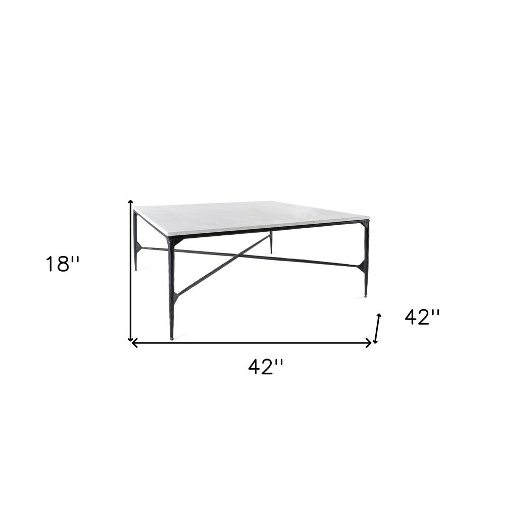 Add handsome, fashionable design to your living space with this 42-inch genuine marble and iron square coffee table. Quality construction from the black iron base combines with white genuine marble of the top to give this table a fresh and updated look. This square table utilizes its unique shape to give your room a modern geometric accent. It has an attractive design that will definitely breathe some fresh air into your interior. This coffee table is the sturdy, reliable and stylish answer to your living room needs. 18-inch h x 42-inch w x 42-inch d.