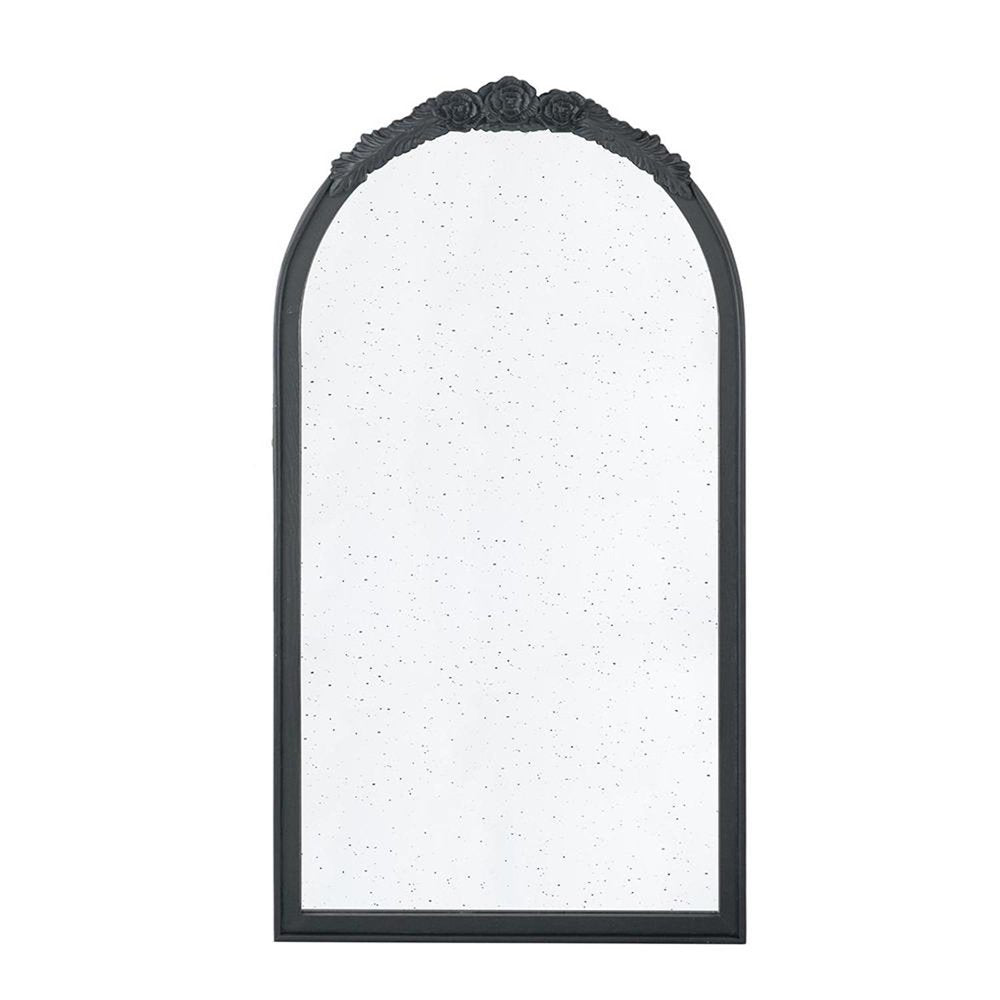Beautify your space with this 42-inch black crowned top arch framed accent mirror that is both original and unique at the same time. An antiqued and distressed mirror finish gives this piece lots of vintage charm. The crowned top arch shaped frame adds a nice touch of depth, texture and design to your space. This unique vintage styled mirror will look great as part of your existing decor or you can use it as a statement piece anywhere in your home. This mirror can fit perfectly in any space and give that space a distinctive look. 41.9-inch H x 22.8-inch W x 2-inch D