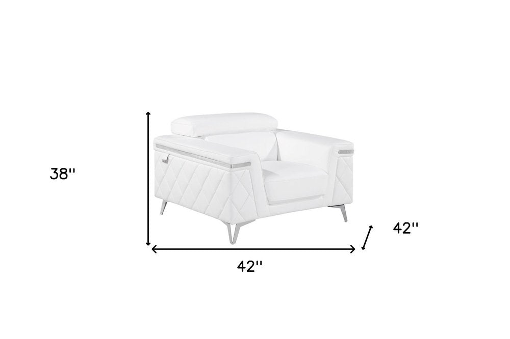 Unique and decorative, this 42-inch white and silver top grain leather club chair will leave a lasting impression. Built to last this club chair is finished in solid white top grain leather to give your room a great update. The high quality solid wood inner frame flaunts convenient armrests and a tight back that are complimented by soft and comfortable cushioning. 38-inch h x 42-inch w x 42-inch d.