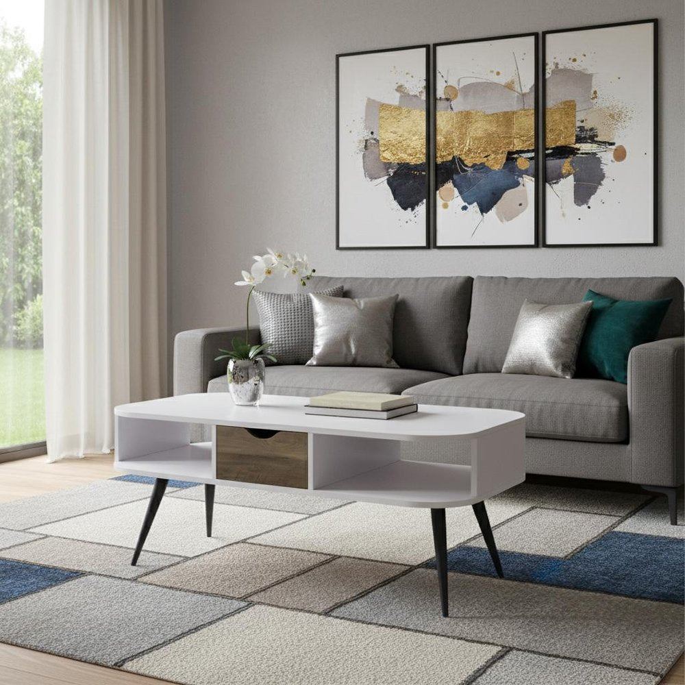 44" White and Black Melamine Veneer And Metal Coffee Table With Drawer And Shelf