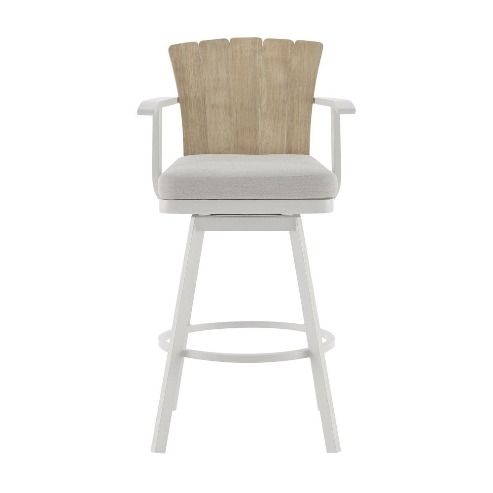 Bring a trendy bar vibe to your space, with this 44-inch gray metal swivel outdoor bar height chair with footrest. The light gray color will leave an indelible mark that showcases your unique personality. Includes detachable cushions that provide you with the option to bring them indoors during unfavorable weather conditions, keeping them protected and ensuring their longevity. The convenience of these zipper removable cushion covers makes it easier to keep your outdoor seating looking its best. When it comes to cushions, you want them to be comfortable, durable, in a color that is neutral and enhances your overall clean design aesthetic. These cushions in gray acrylic will do just that. The square shape of the seat combines with a full back to give this chair a comfortable and fashionable look. Designed with armrests and footrests for your comfort and convenience from top to bottom. For outdoor gatherings on the deck, yard, patio or poolside, this bar stool is a comfy and trendy option. 44-inch H x 23.5-inch W x 25-inch D