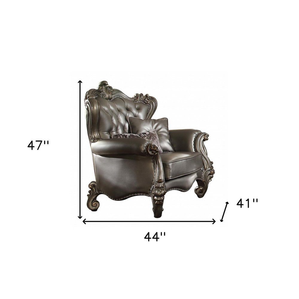 44" Silver and Platinum Faux Leather Tufted Wingback Chair And Toss Pillows