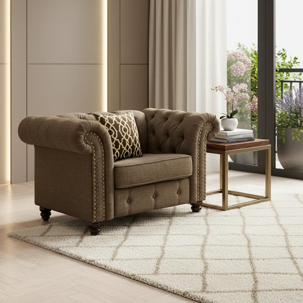 This 45-inch brown and black linen tufted chesterfield chair and toss pillow will add a beautiful decorative accent to your decor. This gorgeous solid color brown chesterfield chair is masterfully upholstered in durable linen. The sturdy inner frame is built with high quality manufactured wood, includes armrests, and features a fixed back that is accented with soft and comfortable cushioning. The tufted cushions add fine designer detailing and are removable for convenience. Nailhead trim gives this chair a refined look that adds additional texture and visual interest. Includes an attractive toss pillow to complete the look. 30-inch h x 45-inch w x 33-inch d.