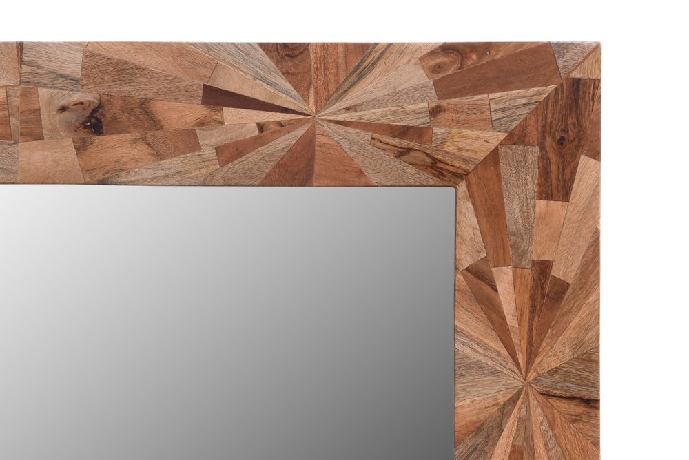 Add a touch of sunshine to any space in your home with this 46-inch brown solid wood geometric starburst framed accent mirror. The rectangle shaped mirror is framed by genuine wood in unique starburst configurations that adds a nice touch of depth and texture to your space. Its rustic style makes this mirror a favorite for bringing some flair to your decor. 46-inch H x 40-inch W x 1-inch D