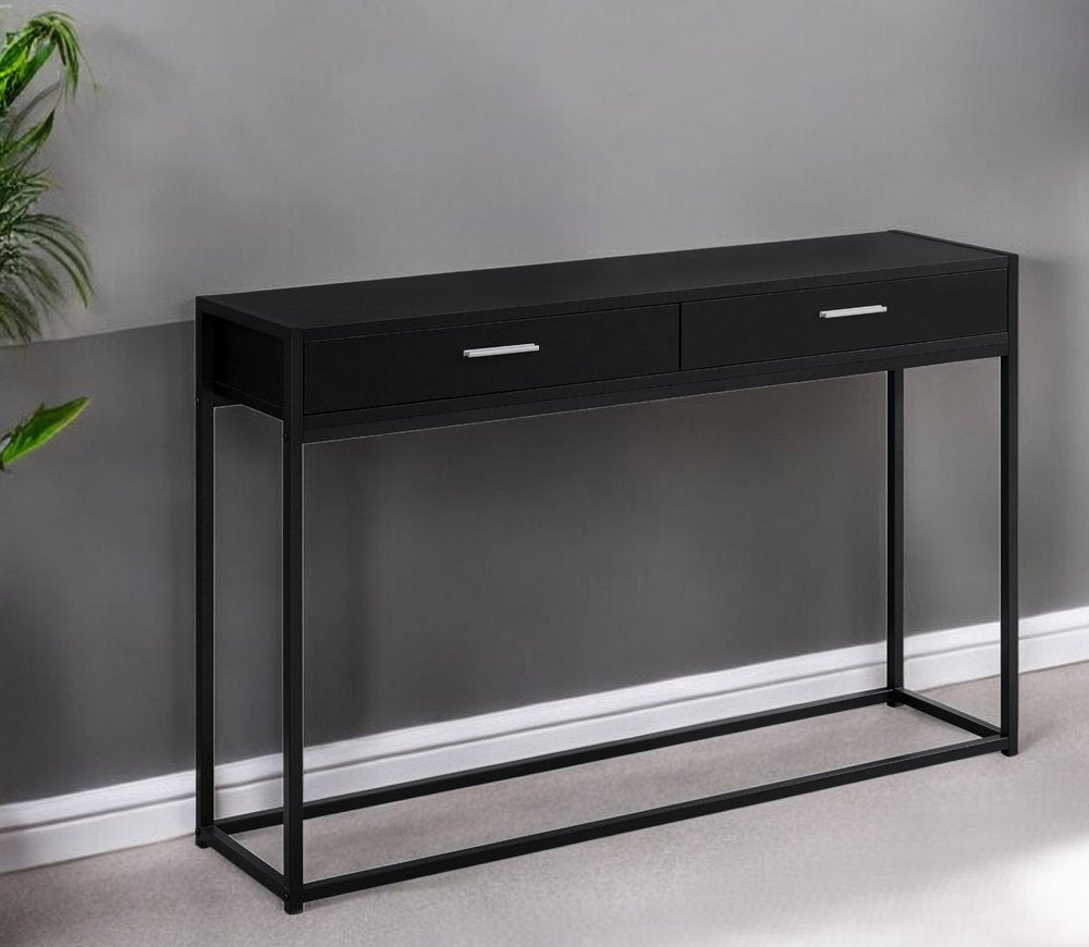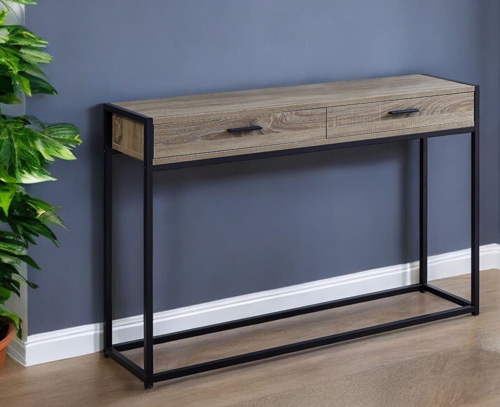 Make a statement in your entryway with our stunning 48-inch gray and black frame console table and drawers. This rectangular table has clean lines and plenty of surface area. This table has a top made with gray manufactured wood that is known for durability and easy maintenance. Versatile in use, console tables can be used for a variety of purposes in a variety of rooms and settings. 32-inch H x 48-inch W x 12-inch D