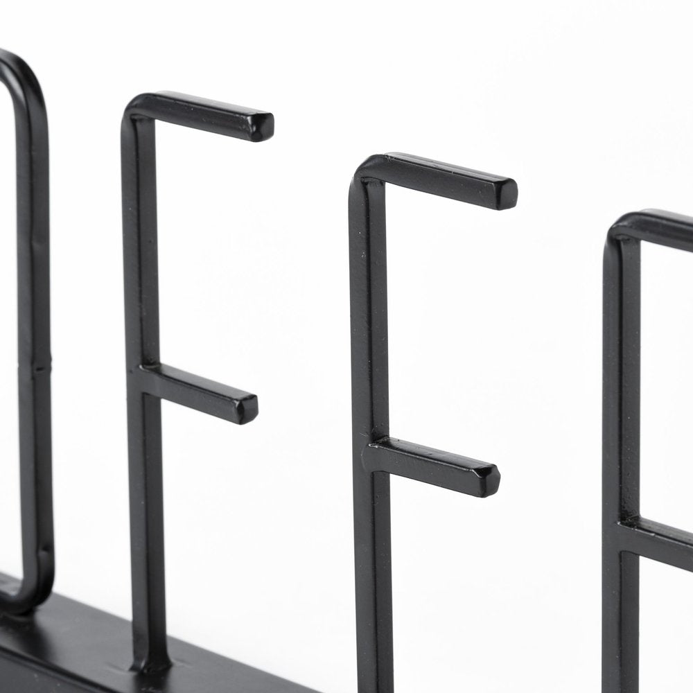 Unique and decorative, this 5-inch black metal coffee tabletop sign will leave a lasting impression. Crafted from high-grade machine-made metal, this sculpture features words and text that spell out "coffee. " the distressed metal adds a touch of character and charm, perfect for those who appreciate a modern aesthetic. Its black color enhances its sleek and contemporary design, making it a purposeful addition to any space with a desire for an up-to-the-minute look and feel. 5-inch h x 15-inch w x 1-inch d.