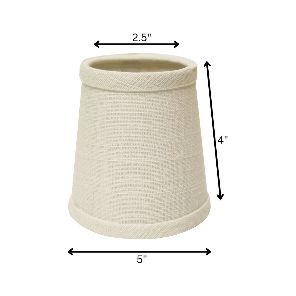 The off white linen empire lamp shade adds a touch of elegance to any room. Designed in a classic empire shape, this lampshade features a clip-on attachment type for easy installation. Crafted from high-quality linen, it showcases a soft off-white color that complements traditional decor. Measuring 2.5 inches in both top width and depth, it is perfect for providing a refined look. With a slant height of 4 inches, this lamp shade enhances the overall aesthetic while diffusing light beautifully. Transform your lighting fixtures with this stylish addition that creates a warm ambiance in your space. Ideal for those who appreciate timeless design, it seamlessly integrates into various decor styles. 4.00-inch h x 5.00-inch w x 5.00-inch d.