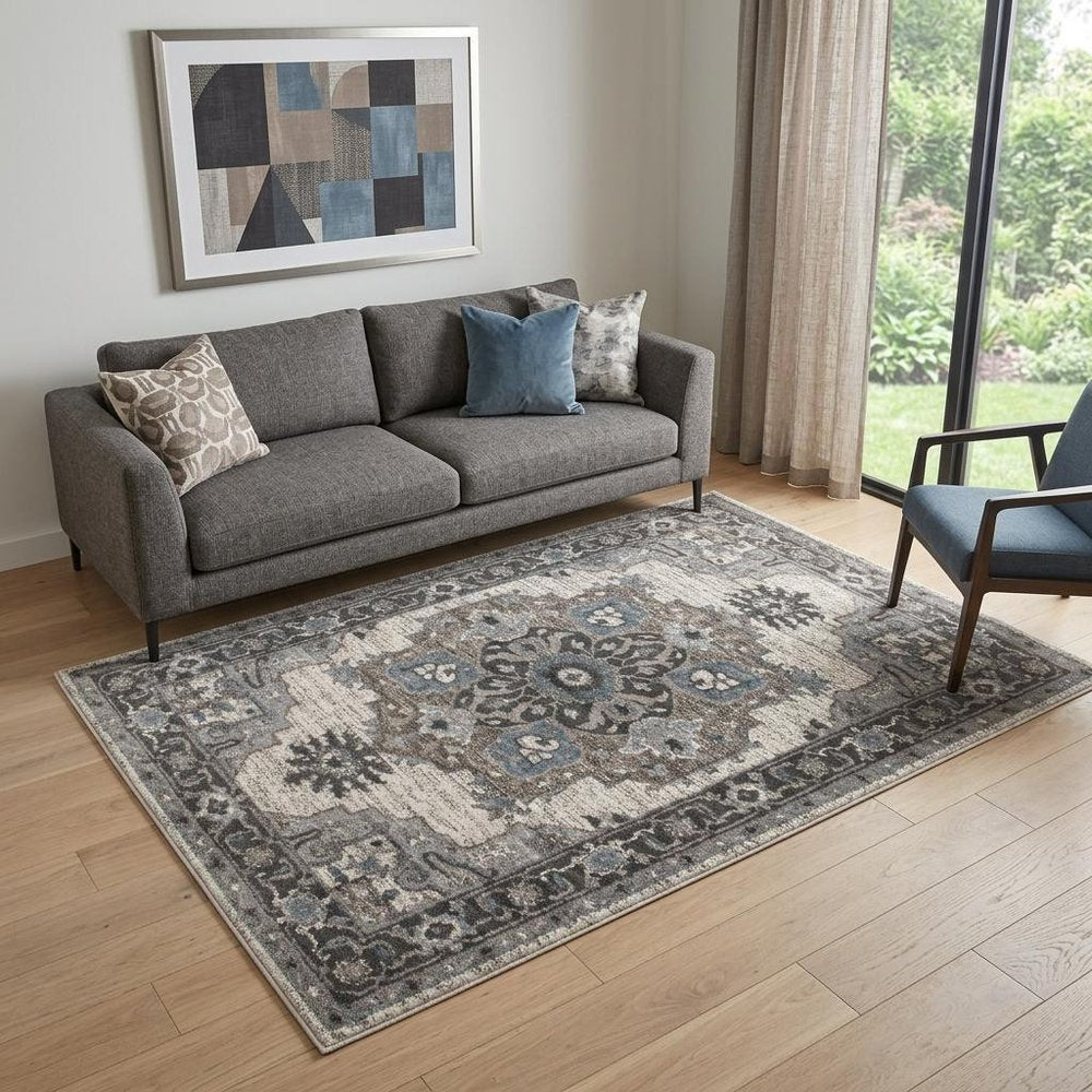 This 5-foot x 8-foot ivory taupe and gray medallion power loom area rug, is a great way to add warmth to a room. This rectangle shaped rug features a medallion design in ivory taupe and gray to give it visual interest. A classic shape marries with good looking design for your space ideal for spaces with kids and pets, this rug is stain resistant to help repel stains and spilled liquids. Place this area rug against a hardwood or tile floor and it will enliven your living space with style and sophistication. 61-inch H x 90-inch W x 0.38-inch D