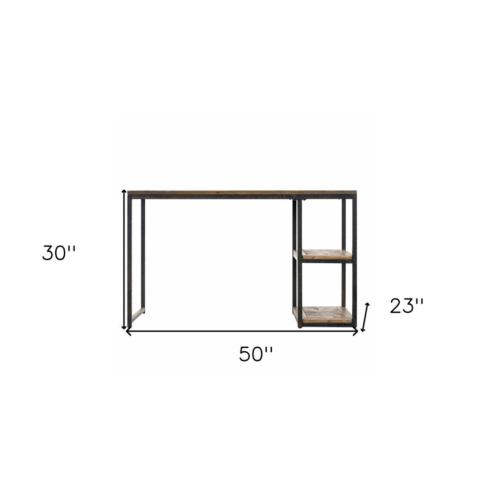 Bring this modern rustic 50-inch brown and black reclaimed wood writing desk to your living room, home office or bedroom as a practical and fashionable accent. With a classic shape and style, this well made rectangular desk features two open cubby shelves down the side to keep your office space looking good. Forged with premium craftsmanship and design, this desk is crafted from reclaimed wood with planks that are organized to create a gorgeous pattern that is rich with all the unique color, knots, and variances that are found in real wood. 30-inch H x 50-inch W x 23-inch D