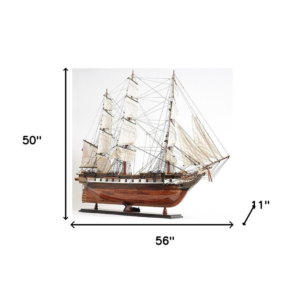 A magnificent and incredibly detailed replica, the 1854 USS Constellation XL Warship Model is a unique hand-built model of the last sail-only warship of the US Navy. Handmade by the most talented craftsman using high-quality teak, rosewood, and mahogany. Featuring three masts, metal canons, handmade lifeboats, and a wooden rudder it is a true beauty. It includes many incredible details and ornaments. It comes with a beautiful solid wood base and a brass nameplate, making it perfect for display. Being an Exclusive Edition model, it has a unique serial number engraved so you can check the production date, materials, and other interesting details. With its quality craftsmanship, it is a sought-after piece for any history or maritime enthusiast. 50" H x 56" W x 11" D