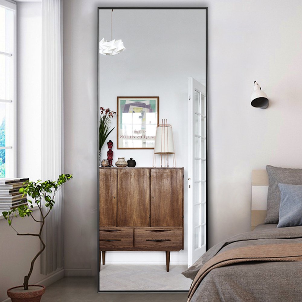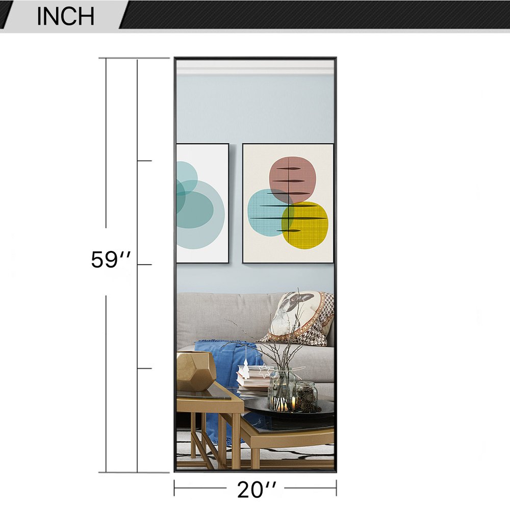 For checking the daily outfit and brightening up the room, this 59-inch black metal framed full length mirror will be a great addition. The frame is made from metal and features a unique narrow and tall design in a black finish. Ready to hang or stand on it's own, use this mirror in your bedroom for last minute checks as you head out, in your closet to help you pick out your outfits in the morning, living room, hallway, or just simply to add some brightness in any room you want. 59.1-inch H x 19.7-inch W x 0.9-inch D