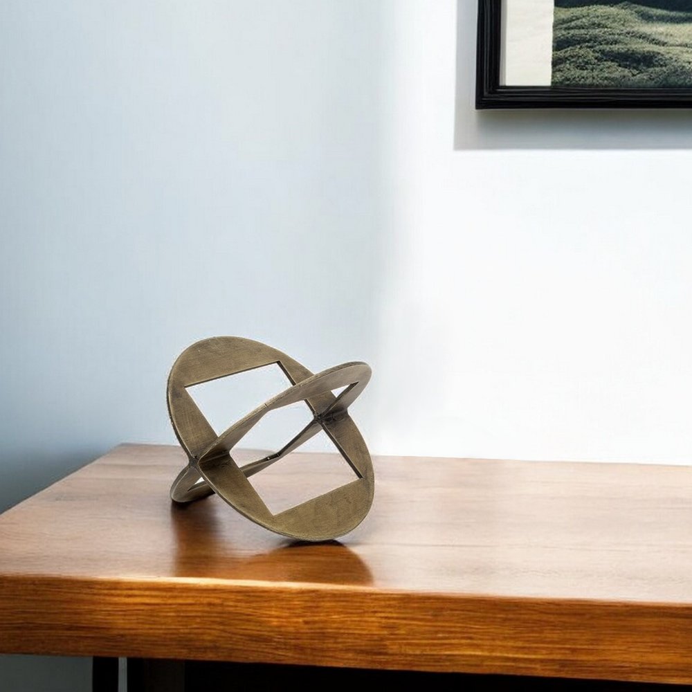 Unique and decorative, this 6-inch gold metal geometric orb tabletop sculpture will leave a lasting impression. Crafted with precision using high grade metal, this sculpture boasts a striking geometric design that adds a touch of elegance to any space. The distressed metal finish gives it a vintage charm, making it a perfect addition to your home decor. Whether displayed on its own or paired with other decorative pieces, this tabletop sculpture is sure to be a conversation starter. 6-inch H x 5-inch W x 5-inch D