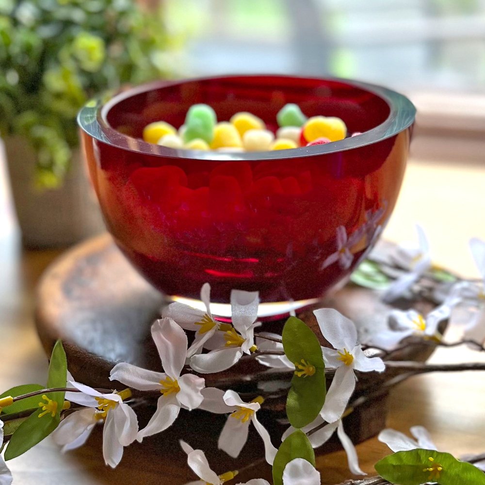 Heavy and obvious in it's superior quality, this European crystal thick walled 6" bowl is a drop dead gorgeous way to serve candy, nuts, or mints. Filled or not, this piece is just as stunning on its own. Makes a great modern accent to your space. A piece of art unto itself, this thick sham bowl with color is unique and oozes modern European design influence. 4-inch H x 6-inch W x 6-inch D