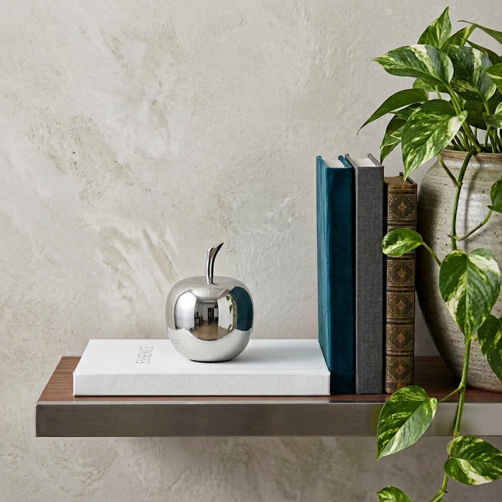 Crafted from high-quality buffed aluminum, this silver decorative apple sculpture exudes modern elegance. Its sleek contemporary style effortlessly enhances any space, making it a perfect addition for those seeking a sophisticated touch. The lustrous silver finish adds a touch of glamour, while the durable material ensures long-lasting beauty. Ideal for those who appreciate chic, up-to-the-minute decor, this sculpture is a statement piece that will elevate your home aesthetic with its exquisite design. 5.5-inch H x 4.25-inch W x 4.25-inch D