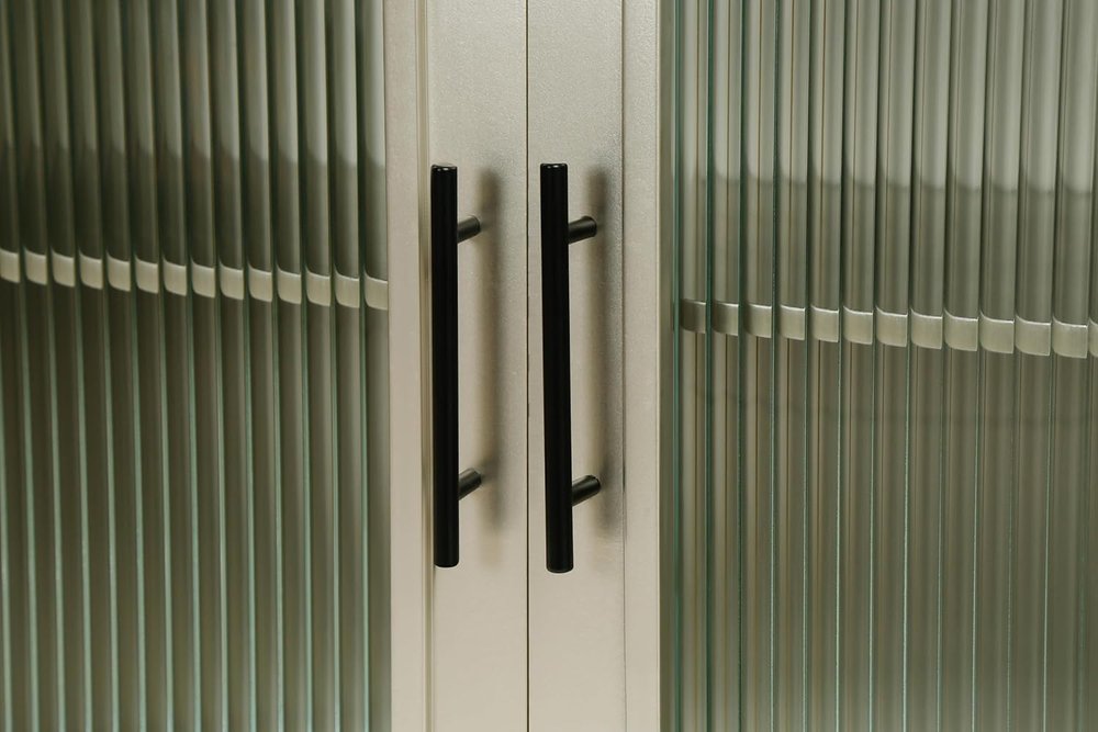 Storage vessels don't have to be unsightly. Increase your storage space and the fashion quotient of your room with this hard wearing, versatile, and good looking manufactured wood sideboard. Featuring shelves for organized storage and open storage for easy access, this modern sideboard in a stylish gold color with ribbed texture detailing adds a touch of elegance to any room. The wood and glass door design further enhances its appeal, making it a practical and visually appealing addition to your home decor. 32.3-inch H x 60-inch W x 15.7-inch D