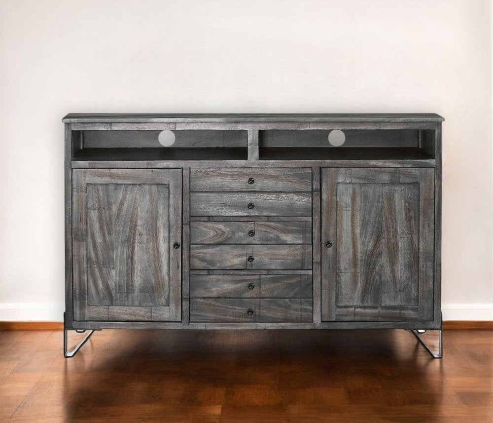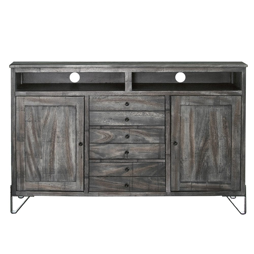 Ready to be enjoyed in your living room, family room, or recreation room, this 60" gray solid wood cabinet enclosed storage distressed tv stand is a practical and good looking piece of furniture that will help to anchor your room. Curated from a mix of high quality solid mango wood and durable manufactured wood, this console is beautiful, and built to last. Due to the genuine nature of the wood some natural wood knots, and grain and color variations may occur. G To add to the versatility, this piece features open non-concealed storage that can be used for not only storage but display as well. Built-in cable and wire management helps to keep those unseamly wires at bay. Convert your room into a special place with your favorite collectibles and TV accessories that is suitable for living room, bedroom, or office. 37.25" H x 60" W x 17.75" D