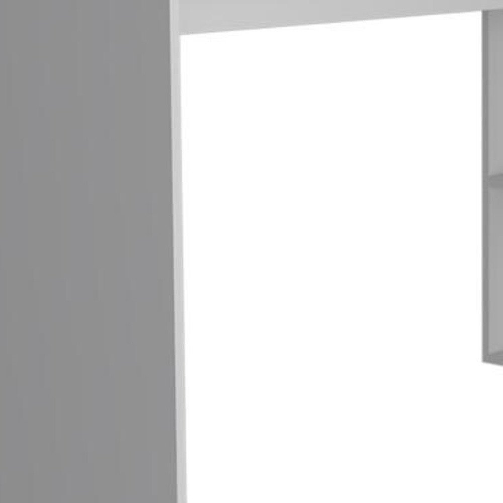 Enhance your office space with this sleek 60-inch l shape computer desk in white. Crafted from durable manufactured wood, this desk features cabinets and shelving for additional storage options. Its modern design and two interior shelves make it a practical choice for any contemporary workspace. Built for comfort and efficiency, this desk is the perfect addition to your home office or study. 30.1-inch H x 59.6-inch W x 45.8-inch D