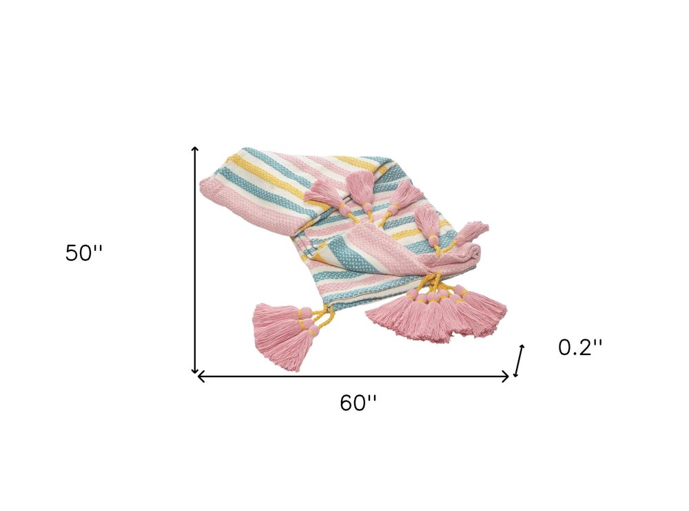 60" X 50" Blue and Pink Woven Cotton Striped Throw Blanket with Tassels