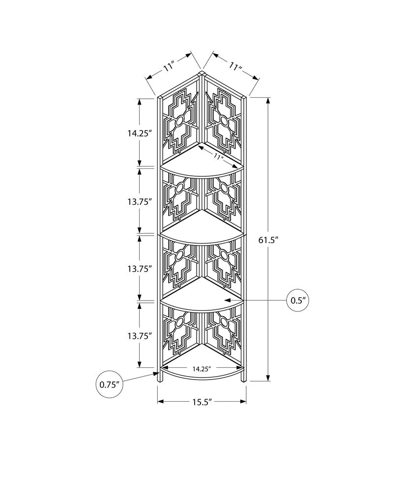 Super versatile, the 62-inch white metal corner etagere bookcase is an ideal piece for your living room, kitchen, bedroom, or office. 4 shelf tiers provide great storage and display options for everything from books and photos to decorations. The sturdy and solid metal frame features beautiful cutwork designs to give this unit extra interest. Increase your room's capacity for storage and display with this ideal corner shelving unit. 61.5-inch H x 15.5-inch W x 11-inch D