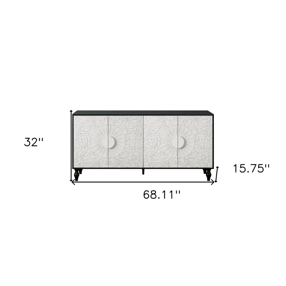 Increase your storage space and elevate the style of your room with this modern sideboard, featuring a black and white color scheme that adds sophistication. Crafted from durable manufactured wood, this versatile cabinet showcases intricate carved floral textural detailing on the doors, enhancing its aesthetic appeal. Boasting open storage shelves and door compartments with the same captivating design, this sideboard perfectly combines form and function to provide both storage utility and decorative charm. 32-inch H x 68.11-inch W x 15.75-inch D