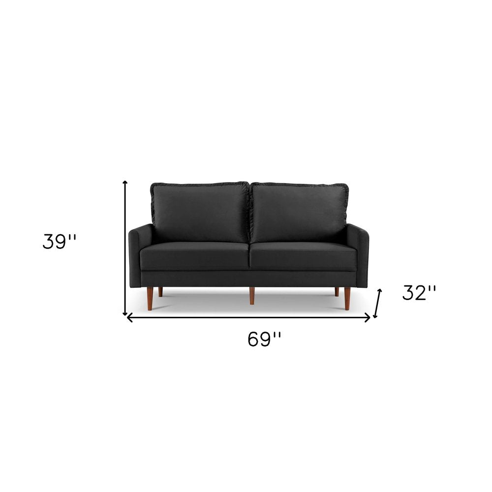 Transform your home's interior with this luxurious 69-inch black velvet sofa with dark brown legs. This solid color standard is made from sturdy and resilient velvet that has a warm and rich look and is a super soft and comfortable to the touch. Solid colors give you lots of decorative options and are easy to work into your decor scheme. Pocket spring construction gives this piece strong support and makes it comfortable to sit even for long periods of time. Track arms offer a comfy place to rest. Dark brown solid wood legs effortlessly elevate the room and add a touch of contemporary design. A great showpiece for your room, this sofa is a must have. 39-inch H x 69-inch W x 32-inch D