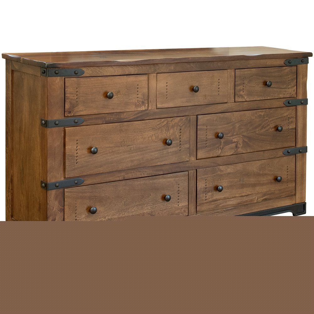 Add personality to your bedroom style and a feeling of coziness with this 70-inch brown and black solid wood seven drawer triple dresser. Designed for you to stand in front of and get ready, this horizontal triple dresser has a convenient and wide top area for your getting ready needs and supplies. Loaded with capacity, this piece is equipped with seven easy open drawers (four large and three smaller), for practical and good looking clothing storage. This versatile piece is made from high quality solid wood and works great as a dresser but could also double as an accent cabinet or sideboard in other spaces as well. 38.5-inch H x 70-inch W x 20-inch D