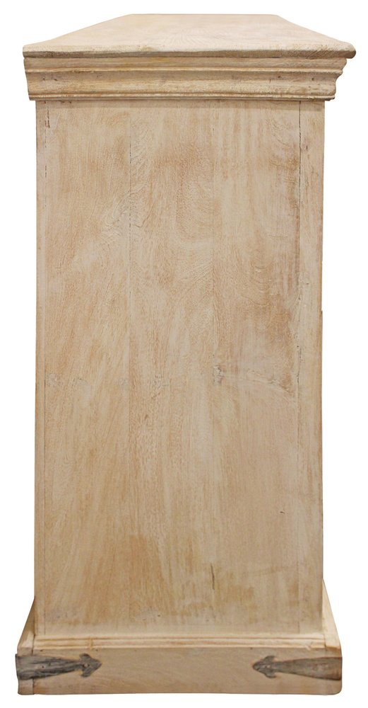 Storage vessels don't have to be unsightly. Increase your storage space and the fashion quotient of your room with this hard wearing, versatile, and good looking cabinet. Crafted from solid wood, this sideboard boasts a traditional style that complements any decor. The beautiful beige color enhances its charm, while the carved scrollwork provides exquisite textural detailing. With shelves included, it offers ample space for your essentials. The distinctive caved floral door design adds a touch of elegance, and purposeful distressing through wood scoring and rub through ensures a timeless appeal. 35-inch h x 71-inch w x 16-inch d.