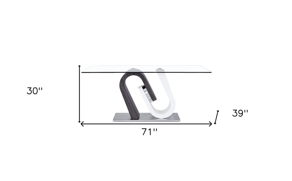 71" Clear And White and Gray Glass And Stainless Steel Pedestal Base Dining Table