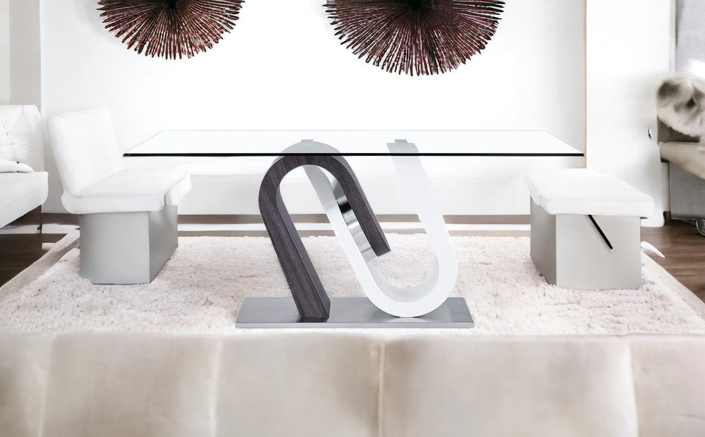 Make a statement with the 71-inch clear and white and gray glass and stainless steel pedestal base dining table and infuse a dash of character and personality into your space. Quality construction from the white and gray stainless steel base combines with clear glass of the top to give this table a fresh and updated two-tone look. Add a touch of modern design to your space with this easy to wipe clean glass top dining table. A beautiful pedestal base adds some dimension and elegance to your dining. Seat up to 6 family and friends around your new dining table. This table is the sturdy, reliable and stylish answer to your dining room needs. This eye-catching dining table is ready for you to enjoy breakfast for one or entertain your guests. 30-inch H x 71-inch W x 39-inch D