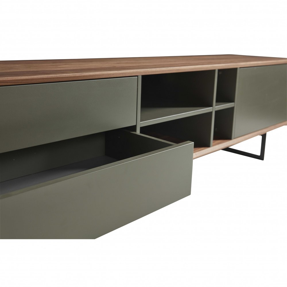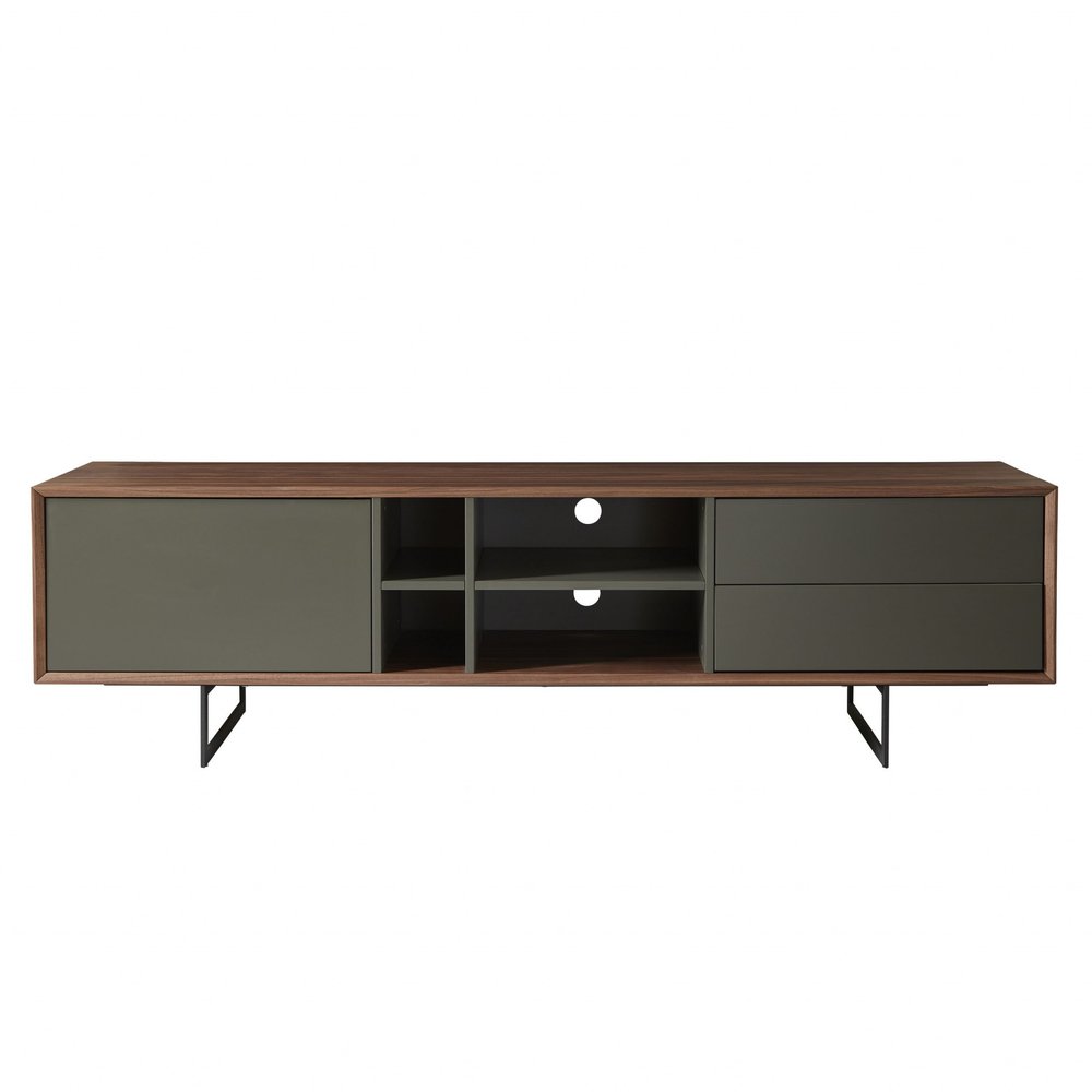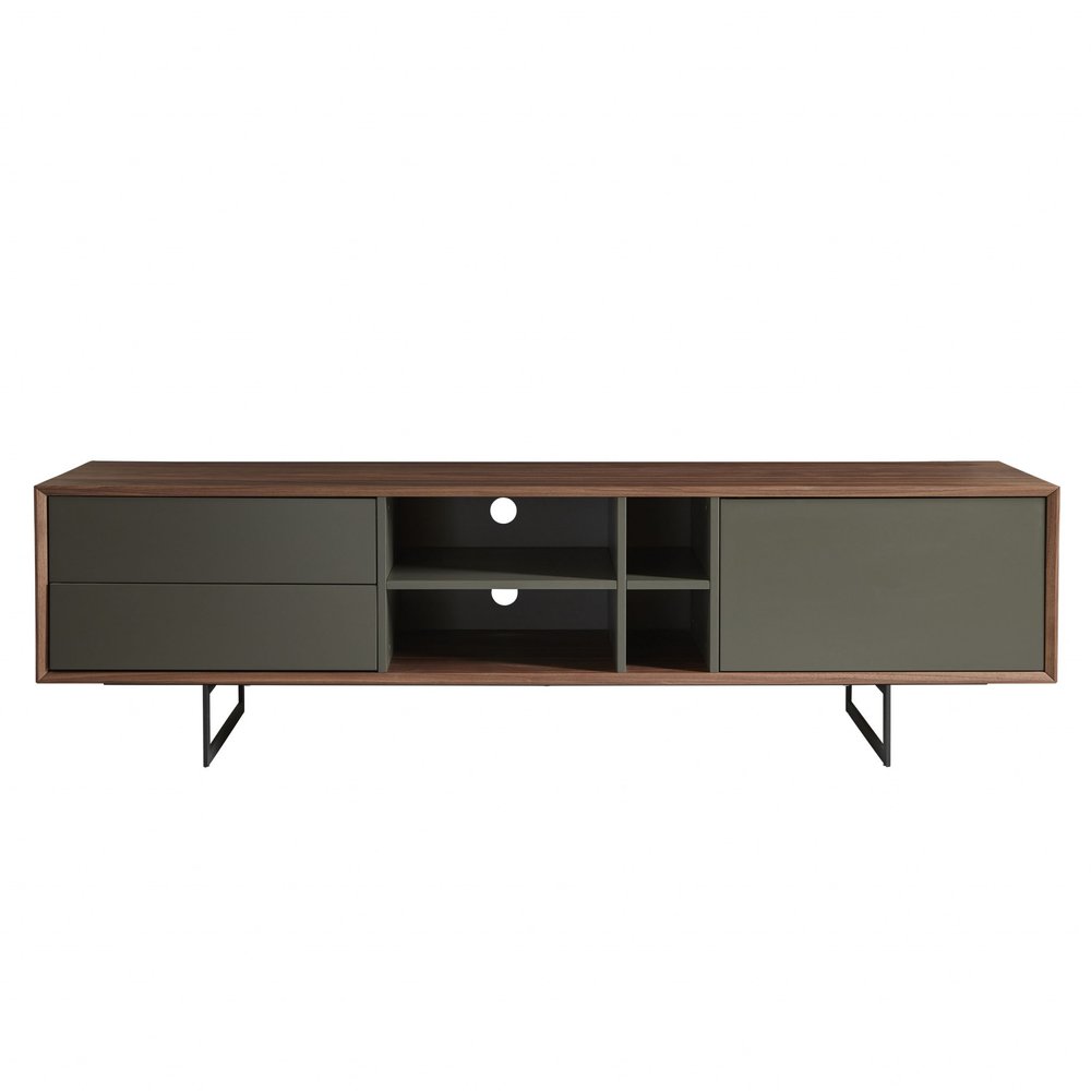 Make the ideal choice for your family room or living space with this 71" Media TV Stand in Walnut and Dark Gray. Full of modern styling and practicality with significant storage options, this TV stand boasts a total of seven compartments for storage that includes two drawers, a cabinet, and two open space shelves that feature back panel holes for convenient and tidy cable management. The black steel legs support the good looking walnut veneered wood outer frame that contrasts with the gray lacquered finish of the doors to give this piece a contemporary and neutral feel. 19.69" X 70.87" X 16.54"