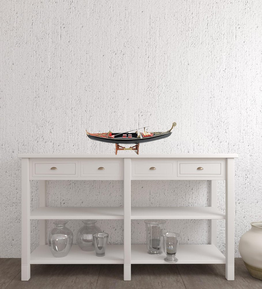 A magnificent piece of world heritage, the Venetian Gondola Small Model is a unique hand-built model of the gondolas that are used for transportation around the Grand Canal in Venice. Handmade by the most talented craftsman using high-quality cedar, rosewood, and mahogany. It features authentic seating and original black and red colors. It comes with a beautiful solid wood base and a brass nameplate, making it perfect for display. With its quality craftsmanship, it is a sought-after piece for any collector or enthusiast. 8" H x 23" W x 6" D