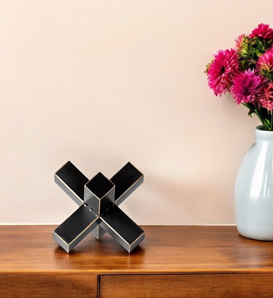 This 8-inch black metal tabletop sculpture, machine-made to perfection, features a nature-inspired design that brings a touch of contemporary style to your living room decor. Crafted from high-grade metal, this piece exudes elegance and sophistication, making it a versatile addition to any space. With its sleek black color, this tabletop sculpture effortlessly complements your existing decor, whether displayed on its own or paired with other decorative accents for a cohesive and chic look. 8-inch h x 8-inch w x 9-inch d.