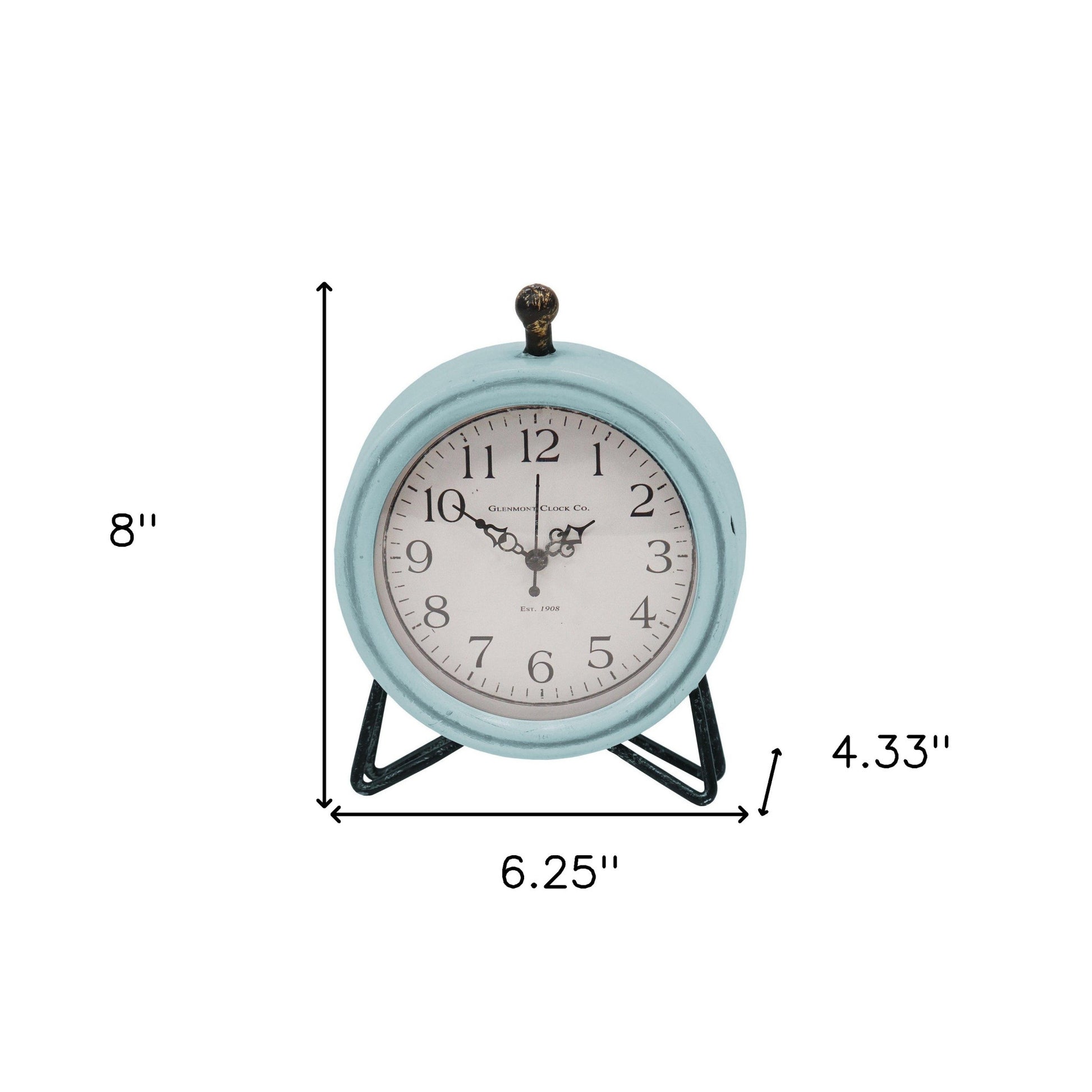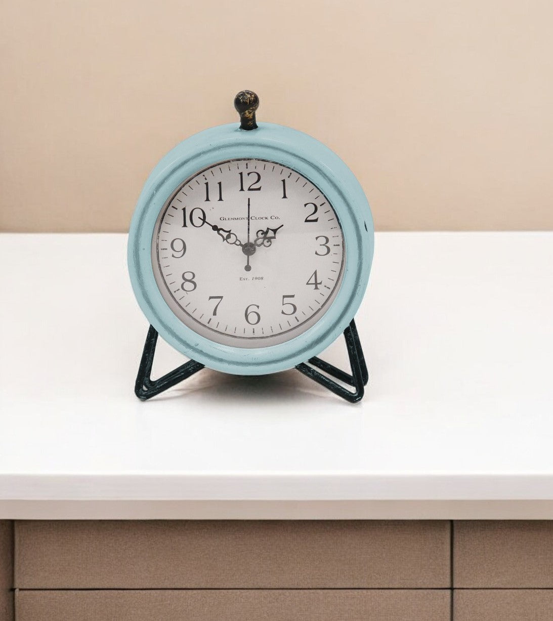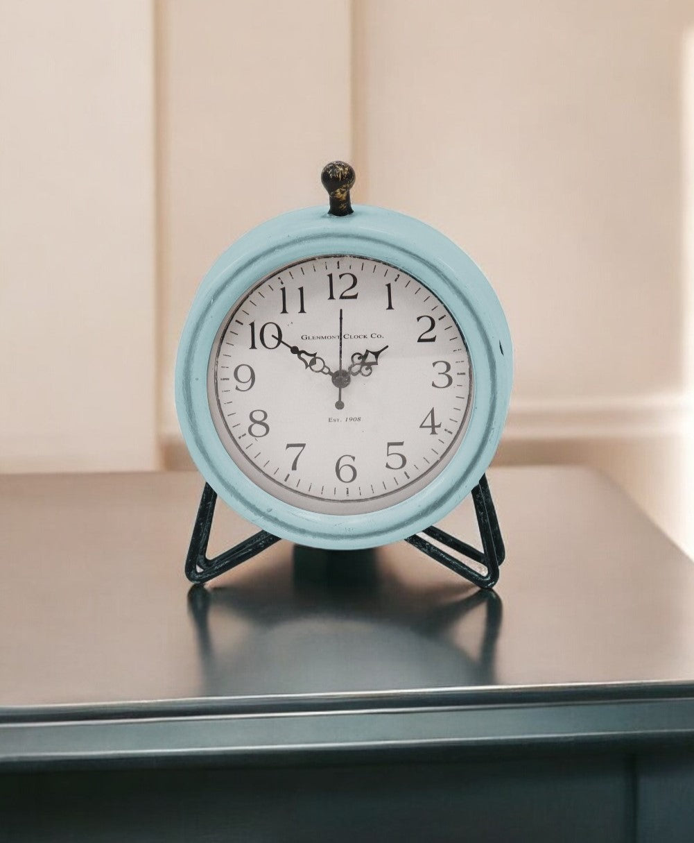 Elevate your living room decor with this hand-finished 8-inch metal table clock in a chic blue and black color combination, ideal for those with a penchant for contemporary style. Crafted from high-grade metal, this sculpture adds a sophisticated touch to any space, boasting a modern aesthetic that exudes elegance and charm. Perfect for those seeking an up-to-the-minute look, this piece seamlessly blends functionality with artistry, making it a must-have addition to your home. 8-inch h x 6.25-inch w x 4.33-inch d