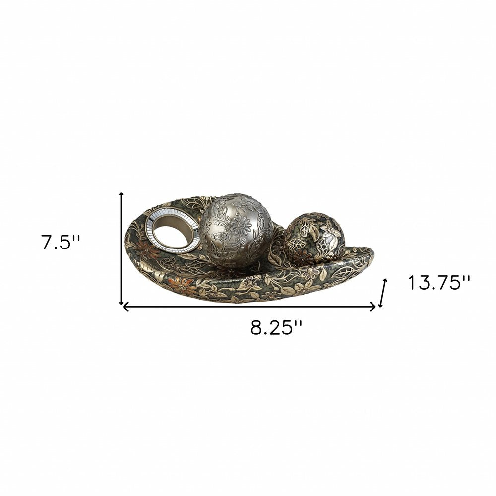 This 8" green silver and gold polyresin decorative bowl with orbs will add a beautiful decorative accent to your decor. This ornate floral design green silver and gold decorative bowl is made from high grade polyresin and includes two round spheres. Some mirror piece accents give this tabletop accessory some extra sparkle and glam. Great to use on its own or mix with other decorations for the perfect look. Use this piece as bookshelf decor, on your desk, coffee table, or anywhere in your home. 7.5" H x 8.25" W x 13.75" D