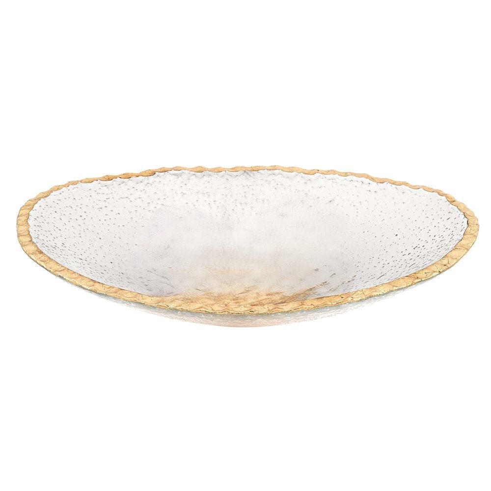 With a beautiful scalloped edge hand painted by skilled artisans, this special bowl is crafted using the finest glass to create a modern and stunning appearance. The oval shape of this serving bowl makes it ideal for displaying salads, fruits, or snacks at gatherings. Its contemporary style blends effortlessly with various dining decors, adding a touch of elegance to your table setting. The clear and gold color combination enhances its visual appeal while ensuring it remains versatile for any occasion. 2-inch h x 8-inch w x 12-inch d.