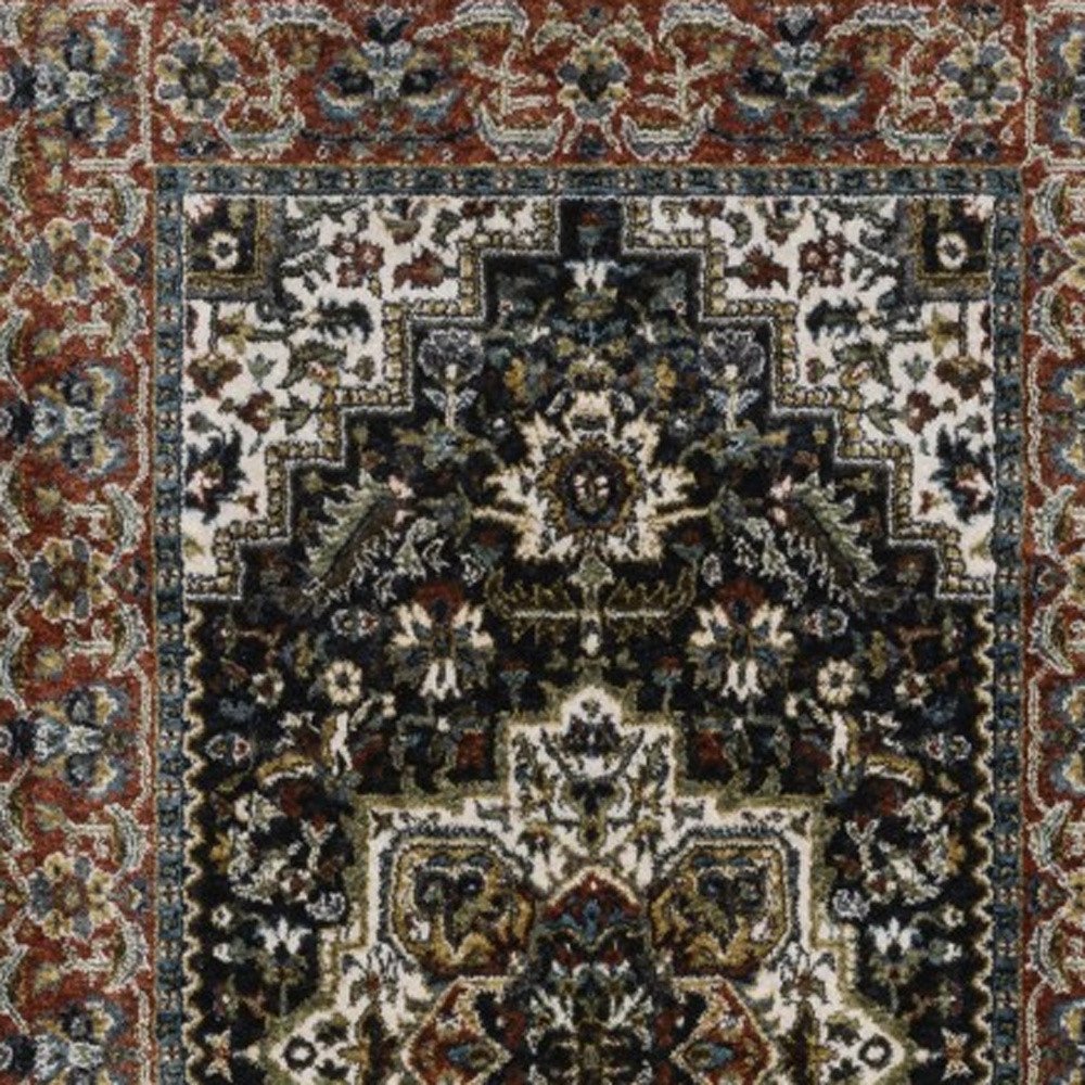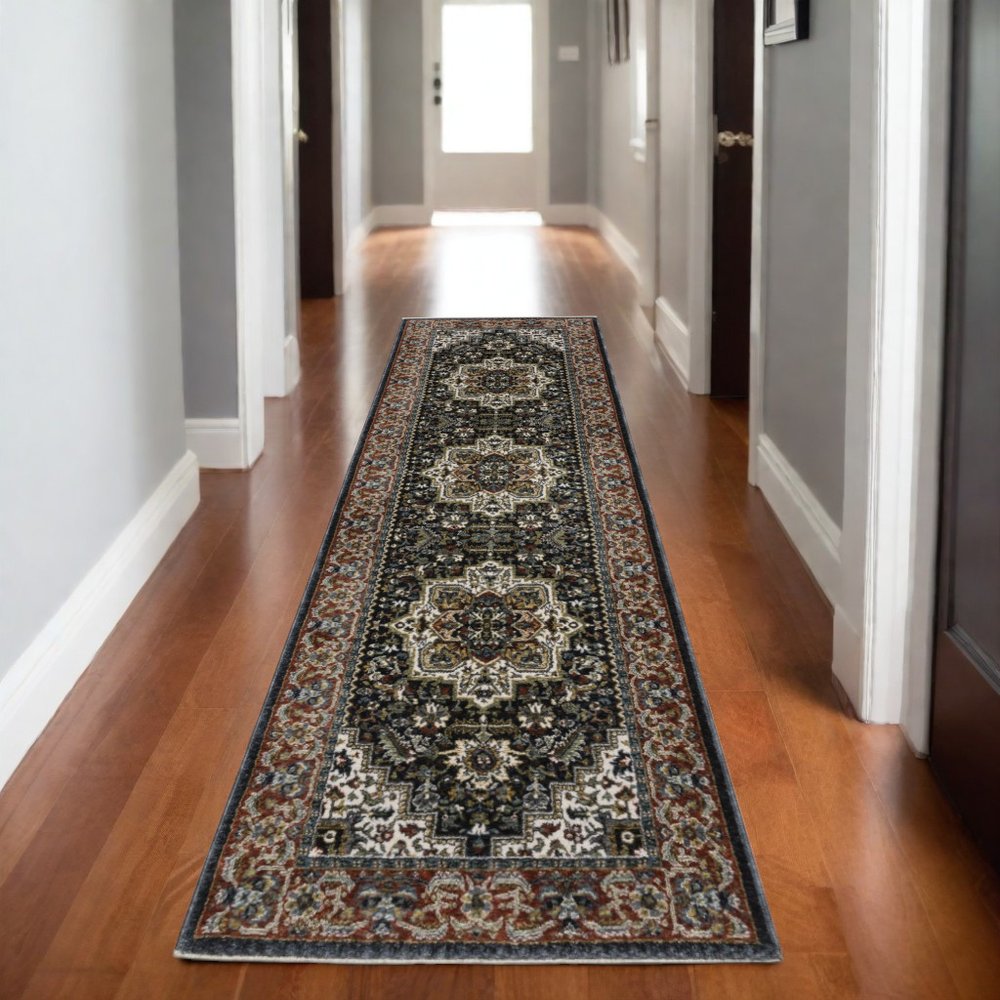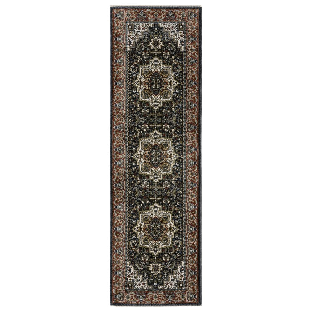 Set an inviting tone in your space with this 8-foot navy blue black and white medallion runner rug with fringe. Ideal for spaces with kids and pets, this rug is stain resistant to help repel dirt and spilled liquids. Built to last, this rug crafted from polyester fibers is known for its durability and long lasting appeal. Rugs are a great way to showcase your style, hide imperfections, warm your home and reduce noise. Tassel ends bring a timeless and fashionable look to your interior. This traditional style runner makes a great accent for the hallway, in front of cabinets, in the laundry room, or any other space you need a narrow and long rug. 26.77-inch h x 92.52-inch w x 0.47-inch d.