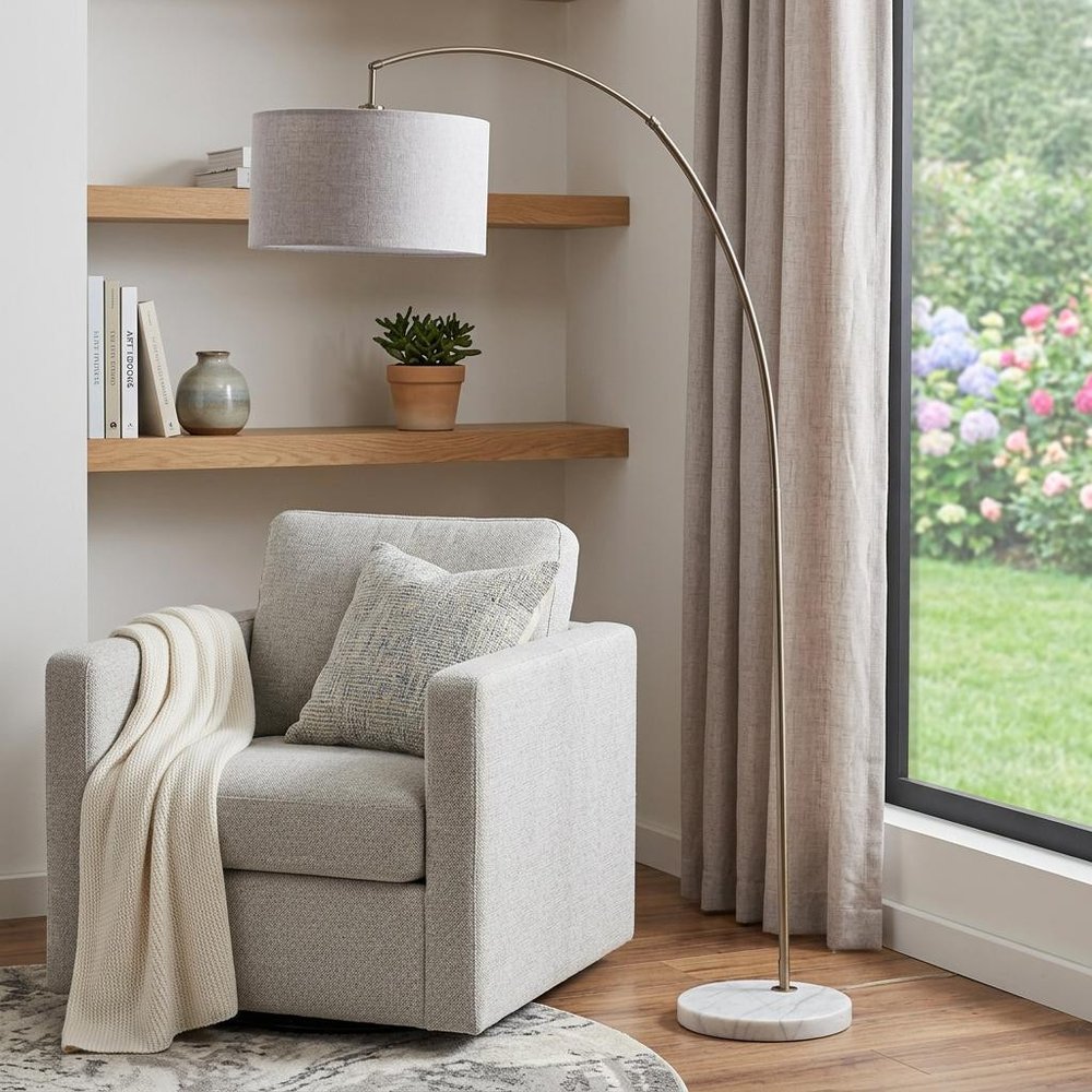 Bring of level of elegance and charm to your space with this good-looking 86" beige and antique gold arched floor lamp with gray drum shade. A gorgeous metal base finished in shades of gold and anchored with marble brings just the right amount of pizzazz to this fabulous lamp. The lamp shade has a drum shape and is made from fabric. A great way to shed light over those hard to reach areas, this arched floor lamp has a single base with a straight pole that extends upwards and a long curving arm. Use this lamp anywhere and elevate the look of the whole space. The perfect lamp to create just the right natural and soothing light in your space. 86" H x 16" W x 52.5" D
