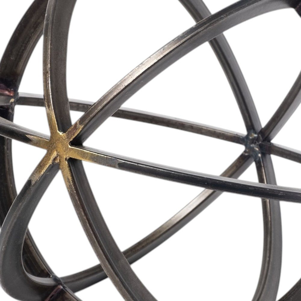 Unique and decorative, this 9-inch black metal round tabletop sculpture will leave a lasting impression. It's a perfect addition for those who love an up-to-the-minute look and feel. Featuring a captivating circular geometric design, this sculpture embodies modern elegance and creativity. Ideal for those who appreciate geometric shapes, it seamlessly integrates with contemporary decor styles. Made from durable metal, this piece not only enhances your space but also stands the test of time with its sophisticated charm. 9-inch h x 9-inch w x 9-inch d.