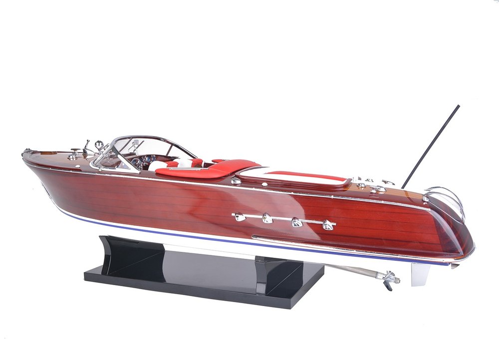 This is a unique hand-built model of the legendary speedboat designed in the 60s. Handmade by the most talented craftsman using high-quality western red cedar and mahogany. It includes incredible details as stainless steel handrails, hand-stitched seats, gold color propellers, and a flagpole. This unique model has been equipped with two 775 brushed remote control motors connected to the aluminum propellers. There are two rechargeable batteries, a charger, and remote control, so you can start it straight out of the box. Multiple layers of varnished have been applied to achieve an unprecedented smooth finish and the bottom has been painted in white and blue. It comes with a solid wood base perfect for displaying. With its distinctive vintage design, it is a sought-after piece for any collector or speedboat enthusiast. 9'' x 26.5'' x 8"