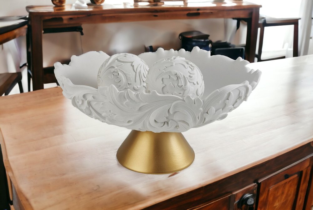 Add an air of fashion to your room and rejuvenate the space with this 9" matte gold and white polyresin decorative bowl with orbs. This matte gold and white hued piece represents high quality, expertly made from high grade polyresin. A perfect decorative addition for anyone who loves a stylish look and feel. You can be certain that you'll be leaving an impression with this unique piece. 8.75" H x 9" W x 15.25" D