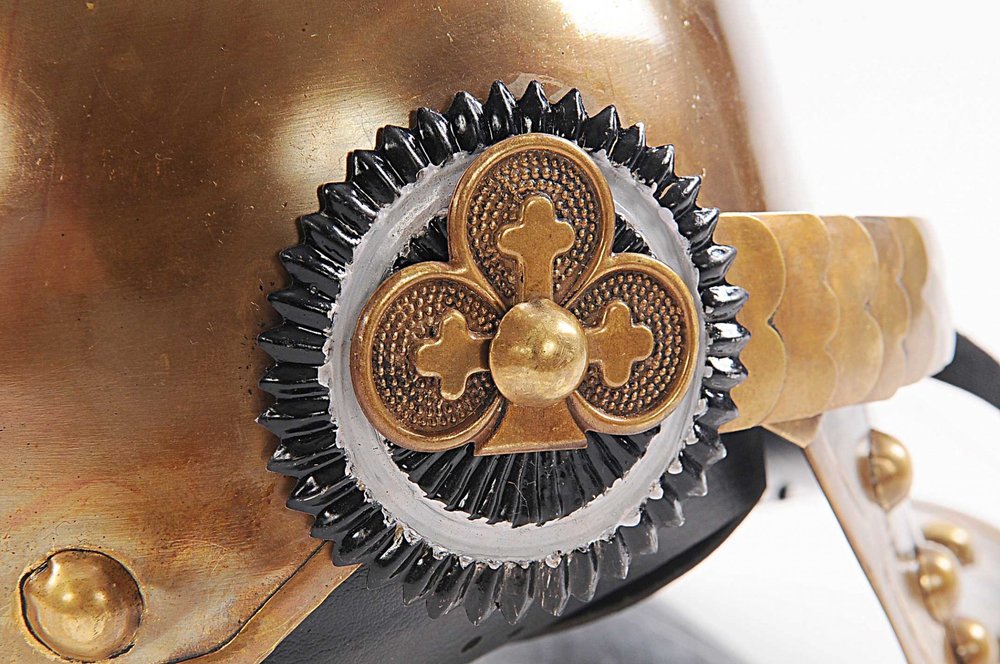 This German Helmet is known as the Prussian Model 1915 Artillery Pickelhaube. The Model 1915 helmet replaced the brass and German silver fittings with steel to aid in the war effort. This model also features a removable spike, to lower the outline of the helmet in the trenches. Instead of a spike, artillery helmets had a ball, which is also removable.
